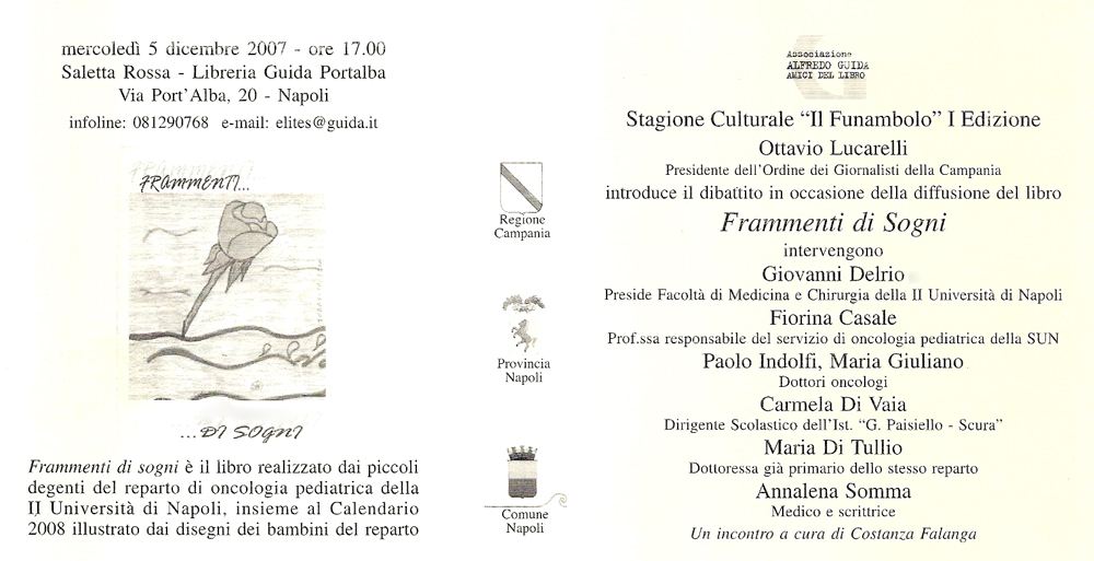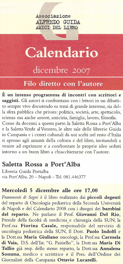 29.11.2007 INVITO. Il giorno 5 dicembre 2007, alle ore 17.00, presso la Saletta Rossa della Libreria Guida a Port'Alba, Annalena Somma parteciperà, insieme ad altri ospiti, alla presentazione del libro "Frammenti di Sogni", realizzato dai piccoli degenti del reparto di oncologia pediatrica della Seconda Università di Napoli. In questa occasione verrà presentato anche il Calendario 2008 realizzato con disegni degli stessi bambini.
