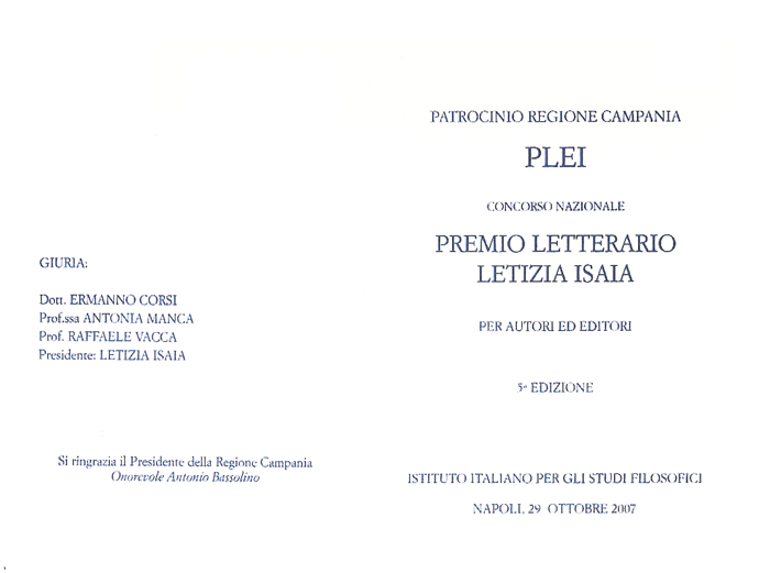 01.10.2007 INVITO PARTECIPAZIONE al "Premio Letterario Letizia Isaia 2007" per il libro "Il giorno dell'orso".
