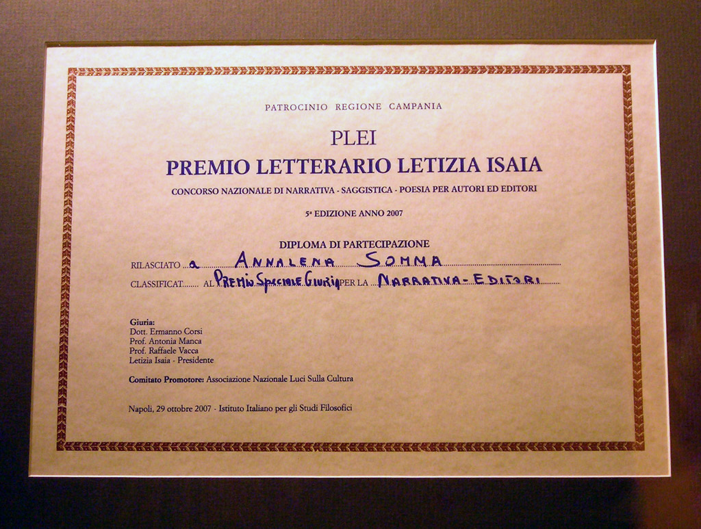 29.10.2007 PREMIO. L'autrice Annalena Somma riceve il "Premio Letterario Letizia Isaia 2007" per il libro "Il giorno dell'orso". Giuria: Ermanno Corsi, Antonietta Manca, Raffaele Vacca, Letizia Isaia. Guarda il video e la foto.
